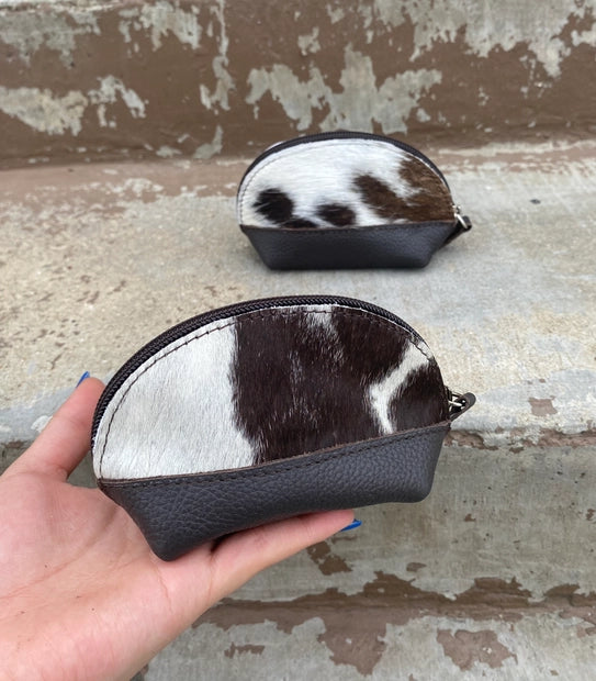 Cowhide coin pouch! Full hair on hide front and back! Great for holding small items like coins, cards and much more! Each coin bag is unique and one of a kind!