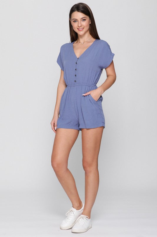 Introducing our Button Down Elastic Romper: a stylish and versatile piece that combines fashion and comfort effortlessly. With a classic button-down front and flattering elastic waistband, it's a must-have for chic and casual look.