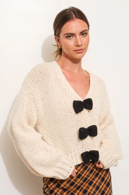 Elevate your style with our Chunky Bow Cardigan! Made with a cozy, chunky knit, this cardigan is perfect for staying warm and looking chic. The contrast bow snap buttons add a touch of whimsy and the semi cropped length and long, balloon sleeves will flatter any body type.